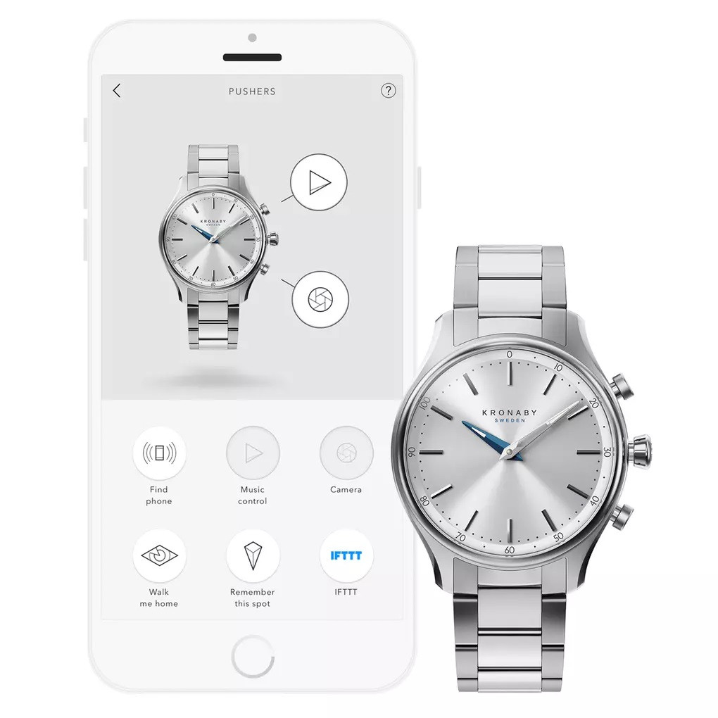 Dupla kupolás zafírüveg tükröződésgátló bevonattal, Lumineszcens mutatók (Super-LumiNova), Kronaby connected movement BT002, Halk, rezgő ébresztő, Szűrhető értesítések, Időzónák automatikus szinkronizációja, Aktivitásfigyelő, Figyelmeztetés túl hosszú tétlenség esetén, Hangfájlok elérése és lejátszása egy gombbal, "Kísérj haza"-funkció, Elveszett telefon megkeresése (Bluetooth hatótávolságon belül), Okostelefon kamerájának távirányítása